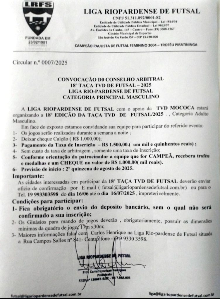As inscrições já podem ser feitas até o dia 16 de julho de 2025, sendo obrigatória a comprovação do depósito bancário para validação da participação. As equipes devem enviar ofício de confirmação para o e-mail da Liga (futsal@ligariopardensedefutsal.com.br) ou entrar em contato pelo telefone/WhatsApp (19) 99330-3598.