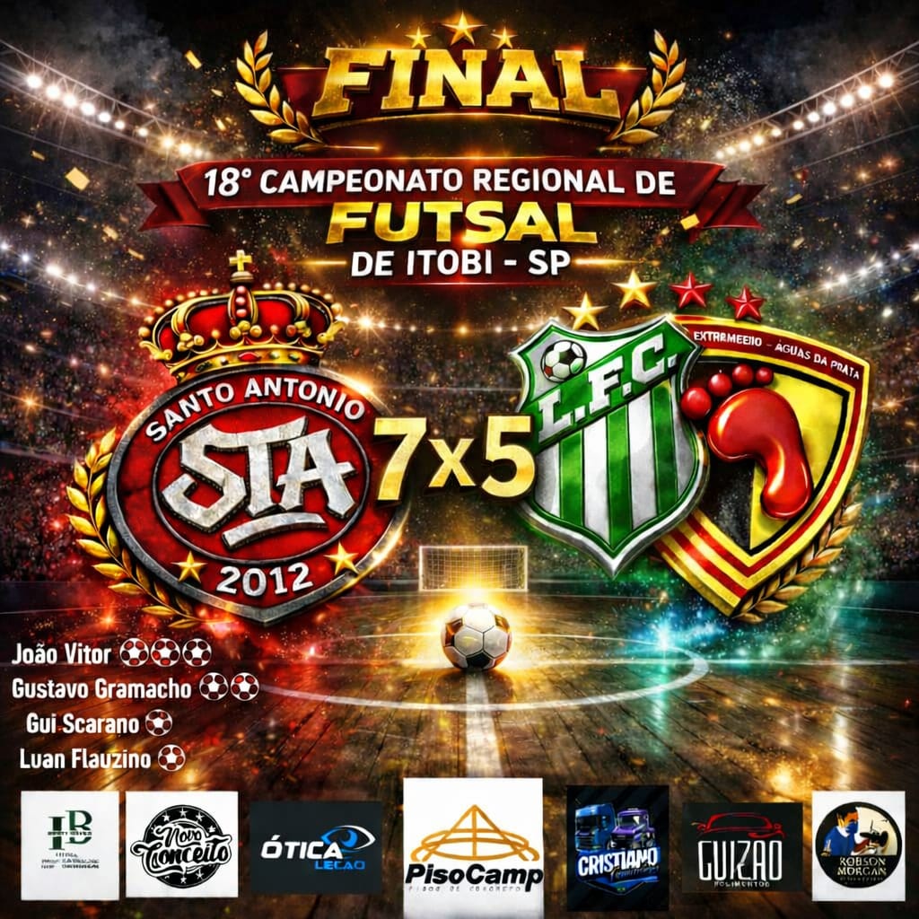 A equipe do Santo Antonio, dos comandantes Pandu, Baby e Paulinho conquistou o tricampeonato do 18º Campeonato Regional de Futsal de Férias Itobi 2026 , encerrado em Itobi, na sexta-feira, dia 27-2-2026. Os outros dois títulos do S.T.A. foram ganhos em 2023, um no mês de fevereiro e o outro no mês de agosto. Portanto, tricampeão do certame.