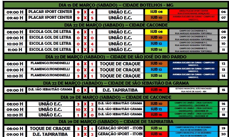A 3ª Copa União Regional de Escolas de Base, evento que reunirá escolas de futebol de praticamente todas as cidades da região, está prevista para começar dia 8 março, com a participação de 10 escolas. As finais do certame estão previstas para o dia 21 de junho, portanto, são 4 meses de competição.