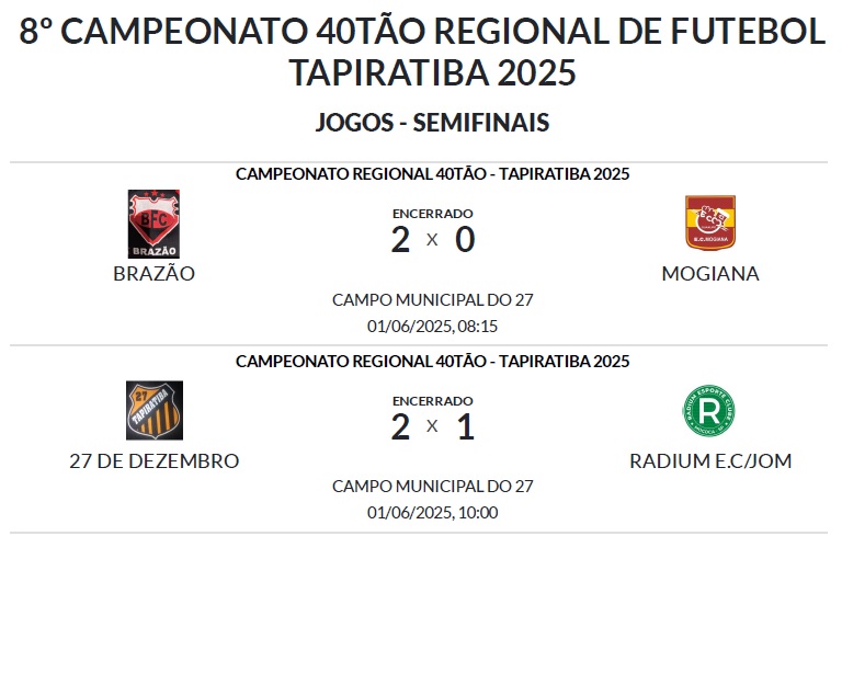 Da cidade de Tapiratiba, o esportista Tiago Martins, responsável pela organização do campeonato denominado 8° Campeonato Regional 40tão (Tapiratiba), informa que as semifinais da competição estão definidas.