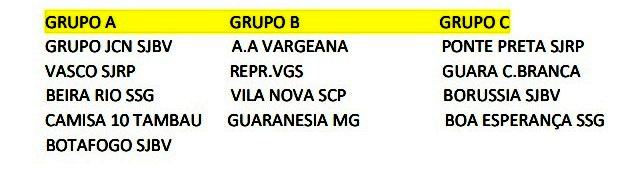Vão participar 13 equipes do Grupo Jcn Sjbv ,A.A Vargeana VGS, Ponte Pret (SJRP), Vasco FC (SJRP), Representante (VGS), Camisa 10 (Tambaú), Vila Nova SCP, Guará Casa Branca, Guaranésia FC MG, Boa Esperança SSG, Beira Rio SSG Convidado, Botafogo FC SJBV Convidado e California FC SJBV Convidado.