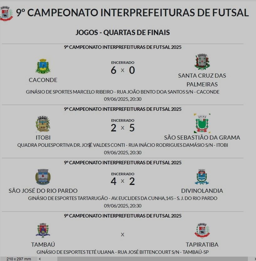 Estes são os confrontos das quartas de final do 9º Campeonato Interprefeituras de Futsal. O sorteio foi realizado na tarde desta quarta feira, dia 4-6-2025.