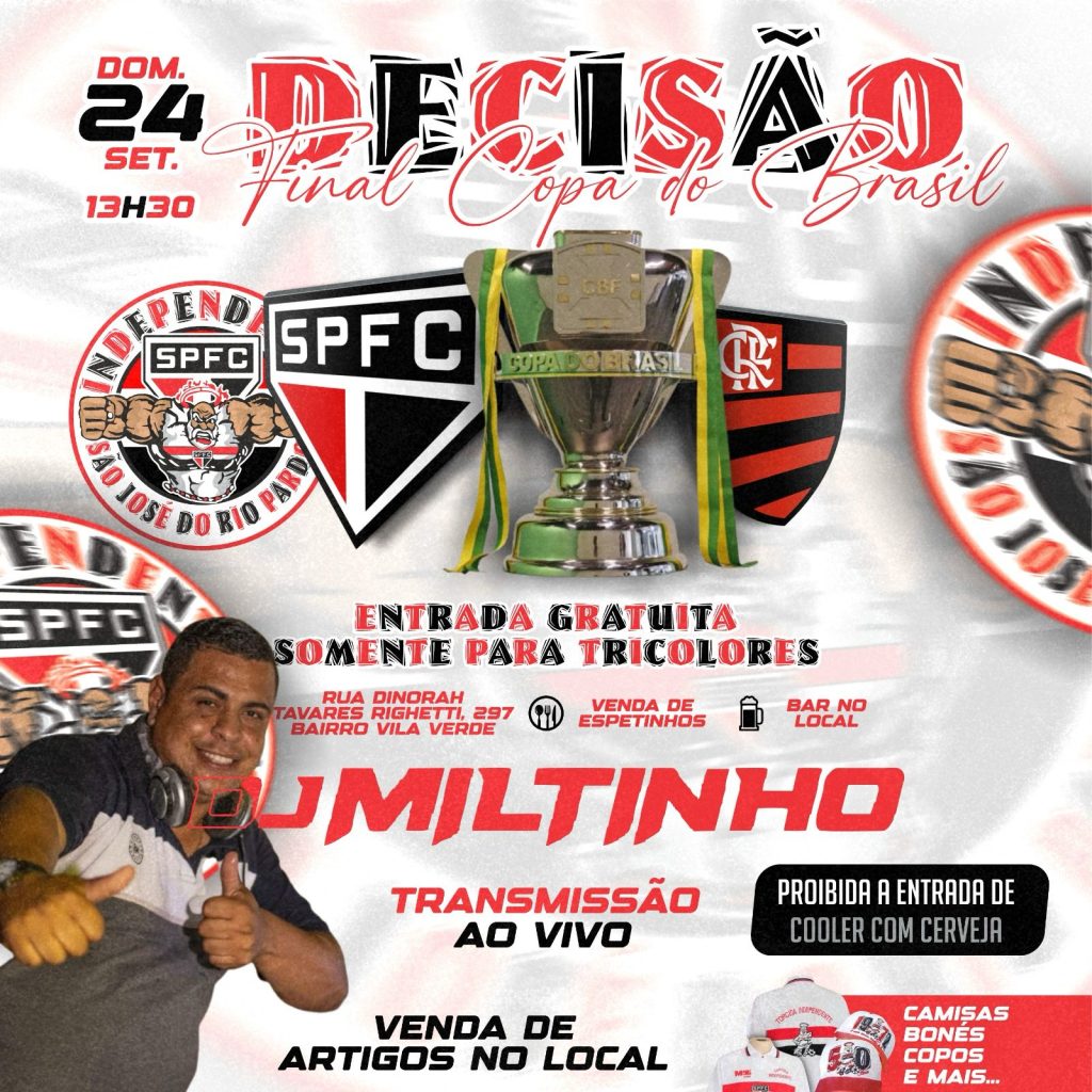 O esportista Murilo Vinhas, que lidera a Torcida da Independente, em São José do Rio Pardo informa, que a exemplo de domingo passado, quando reuniu dezenas de torcedores do São Paulo para acompanhar a partida Flamengo e São Paulo, neste domingo, dia 24-9-2023, quando acontece a Super Decisão no Morumbi, não será diferente e novamente estará reunida para acompanhar o jogo e torcer muito pelo São Paulo FC.