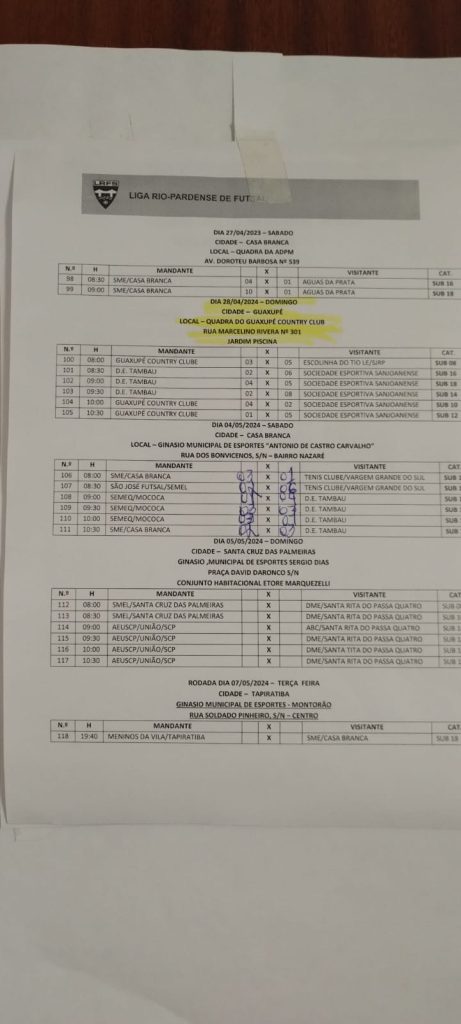 No domingo, dia 5-5-2024, os jogos serão realizados em Santa Cruz das Palmeiras, com a seguinte programação: