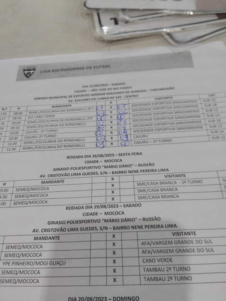 Os campeonatos da LRFS prosseguiram neste sábado, dia  12/08/2023, em São José Do Rio Pardo, com jogos disputados Ginasio Municipal de Esportes Ademar Machado de Almeida, Tartarugão. Foram 8 jogos com 48 gols assinalados pelos garotos participantes do certame.