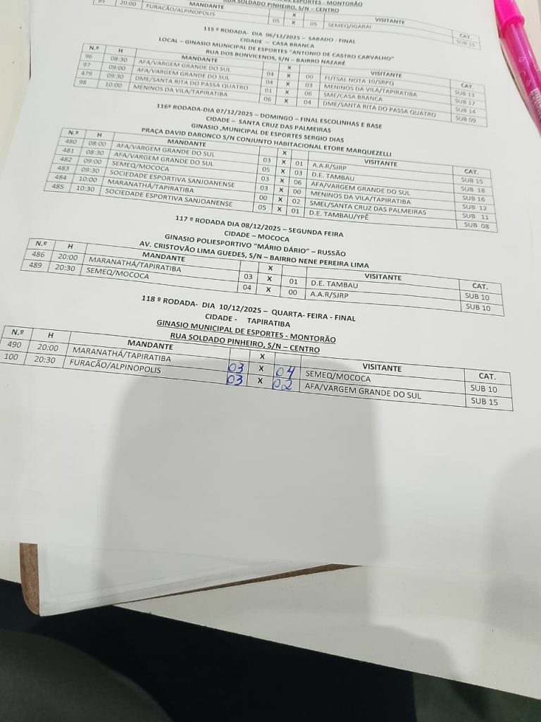 Os jogos decisivos prosseguem neste domingo, dia 7-12-2025, em Santa Cruz das Palmeiras