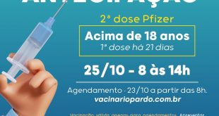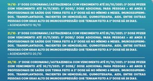 Saúde divulga cronograma quinzenal de vacinação. Confira. A Secretaria de Segurança divulgou informe contendo um cronograma quinzenal de vacinação contra a covid-19. De acordo com o boletim, no dia 19-10-2021, será aplicada da segunda dose coronavac e astrazeneca com vencimento até 20-10-2021; segunda dose Pfizer com vencimento até 19-11-2021; 3ª …