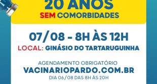 Vigilância anuncia vacinação para quem tem 20 anos para o dia 7-8-2021 A Vigilância Epidemiológica está anunciando a vacinação para quem tem 20 anos para o dia 7-8-2021. O agendamento, obrigatório, deve ser feito no dia 6 de agosto, das 8 horas, até 20 horas, no www.vacinariopardo.com.br “Chegou a vez …