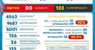 Mais 20 casos positivos. Vejam também calendário municipal de vacinações Mais 20 casos positivos foram anunciados pela Vigilância Epidemiológica na tarde de quarta (9). Agora, de acordo com o boletim o município está com 4.563 casos positivos, dos quais 4.317 estão curados. 123 mortes foram confirmadas desde início da pandemia. …