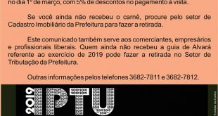 A Prefeitura de São José do Rio Pardo está realizando a entrega de carnês do IPTU 2019. O primeiro vencimento em cota única será no dia 1º de fevereiro, com 10% de descontos para pagamento à vista; ou no dia 1º de março, com 5% de descontos no pagamento …
