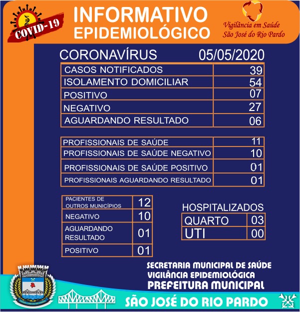 Com isso, chega a 7 o número de casos positivos em São José do Rio Pardo. Os notificados somam 39, em isolamento domiciliar estão 54 pessoas, 7 casos deram positivos, 27 foram negativos, e outros seis aguardam análise.