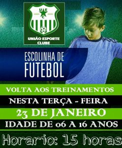 A ESCOLA DE FUTEBOL UNIÃO E C retorna os treinamentos nessa TERÇA FEIRA, dia 23-1-2018, às 15 horas, no campo do União, em Caconde, no Campo do União . Na ocasião, os alunos deverão retirar suas fichas de matriculas.