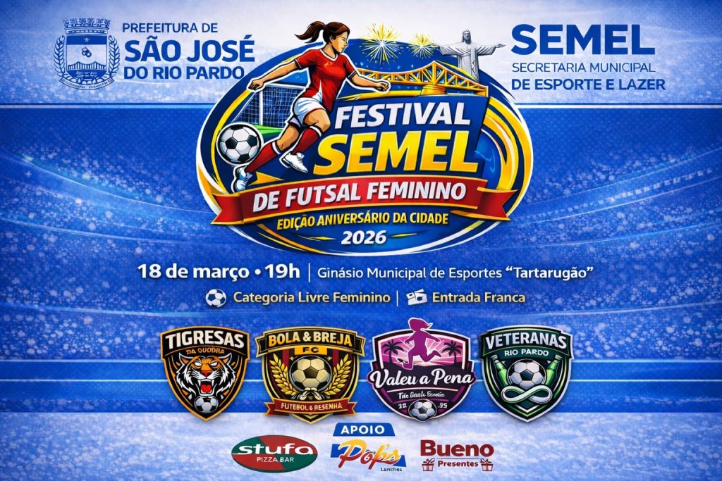 Dentro da programação esportiva em comemoração ao aniversário da cidade, será realizado na quarta-feira, 18 de março de 2026, o Festival SEMEL de Futsal Feminino – Edição Aniversário da Cidade.