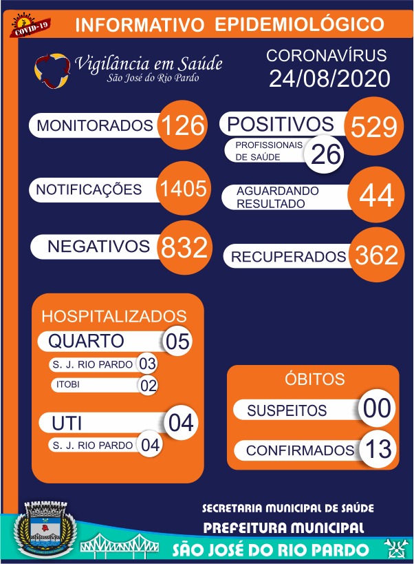 A Vigilância Epidemiológica divulgou na tarde desta segunda-feira (23) mais um boletim de covid-19, em São José do Rio Pardo. De acordo com os números, o final de semana registrou mais 22 casos e agora o município está com 529 positivos, sendo que destes 362 já estão recuperados.