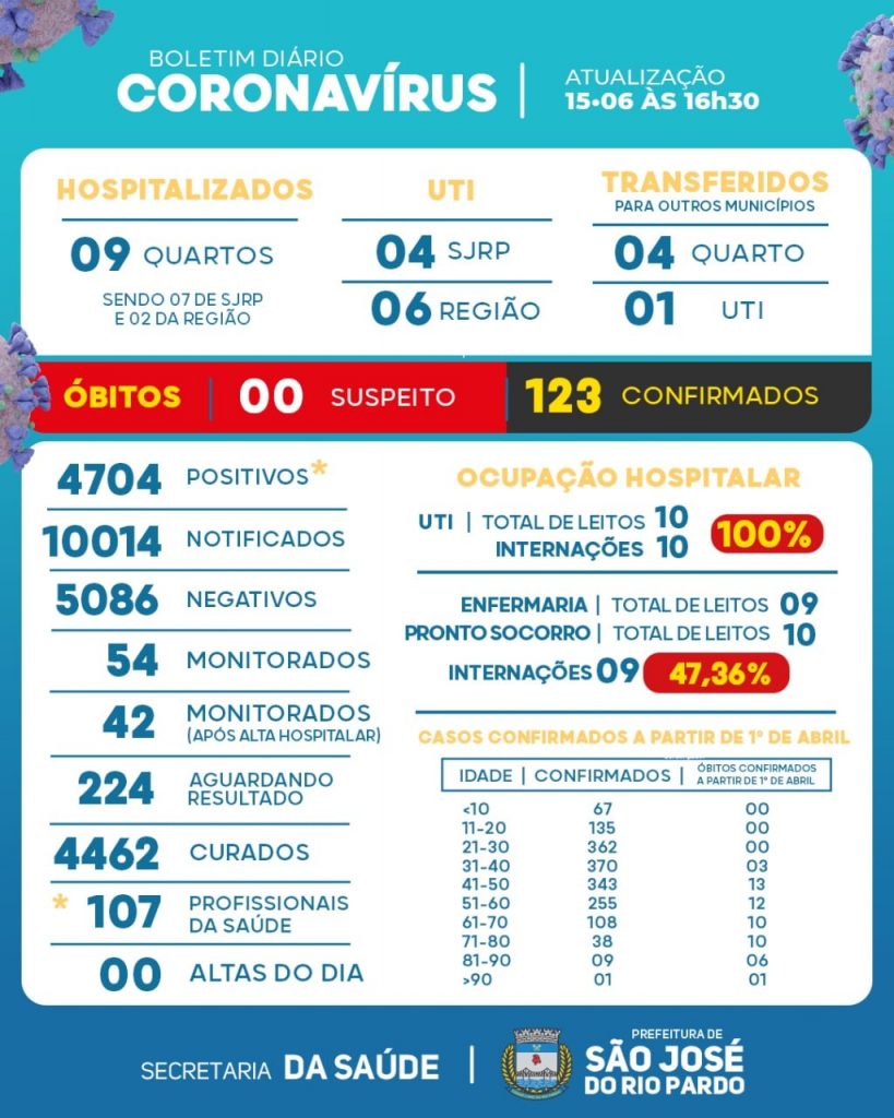 O boletim mostra que 22 pacientes estão internados no hospital local, sendo 10 em UTI. Além disso, cinco pacientes estão hospitalizados em hospitais da região, sendo três em quartos e dois na UTI. O município está com 123 mortes confirmadas.