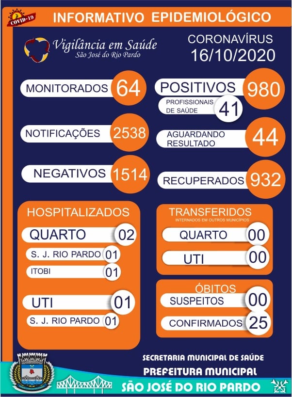 A Vigilância Epidemiológica divulgou na tarde desta sexta-feira (16) mais um boletim informativo de covid-19, em São José do Rio Pardo (SP). De acordo com os dados, mais 7 casos foram confirmados e agora o município está com 980 confirmados, sendo que destes 932 já estão recuperados.