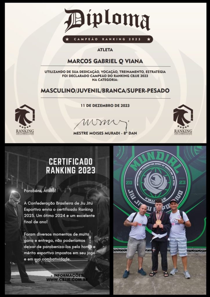 O reconhecimento não para por aí. Marcos Viana recebeu o prestigioso diploma de campeão do ranking da Confederação, uma conquista que reflete não apenas suas habilidades atléticas, mas também seu comprometimento com a prática do jiu jitsu esportivo.