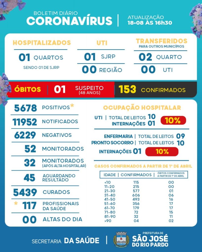 O boletim mostra que 2 pacientes estão internados no hospital local (Um em quarto e um na UTI Ala Covid) e dois pacientes de São José do Rio Pardo estão internados em quarto de hospitais da região.