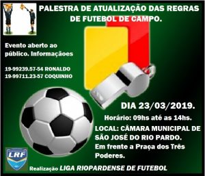 Uma palestra sobre atualização das regras no futebol vai ser realizada dia 23-3-2019 na Câmara Municipal  de São José do Rio Pardo. O evento terá inicio às 9 horas da manhã e  terminará por volta das 14 horas. Realizada pela Liga Riopardense de Futebol, a palestra é aberta ao público, mas dirigida, claro, para os atuais árbitros de futebol ou pretendentes à arbitragem. Os interessados devem entrar entrar em contato com Ronaldo Amoroso, pelo telefone 99 239 5754 ou com Coquinho, pelo telefone 99 711 2357. Haverá uma taxa de R$ 50 reais para todos os participantes. Agora, para quem já atua em certames da LRF,  poderá ser descontada nas taxas pagas pela entidade