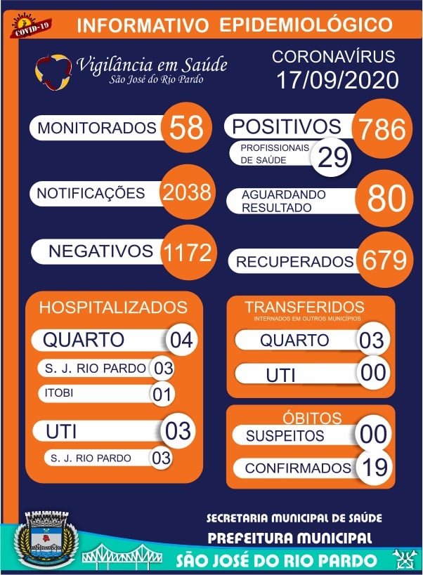Ainda segundo o informe, sete pessoas estão internadas na Santa Casa de Rio Pardo, três delas na UTI. Quatro estão hospitalizados em quartos (três de São José do Rio Pardo e um de Itobi) e na UTI, estão três pacientes, todos de São José do Rio Pardo. Três rio-pardenses estão internados em quartos de hospitais em outros municípios.