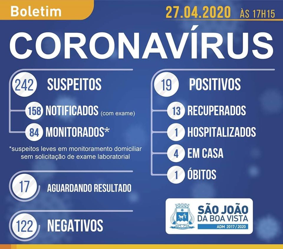 Confiram no Boletim da VE, os dados atualizados em São João da Boa Vista, em 27-4-2020