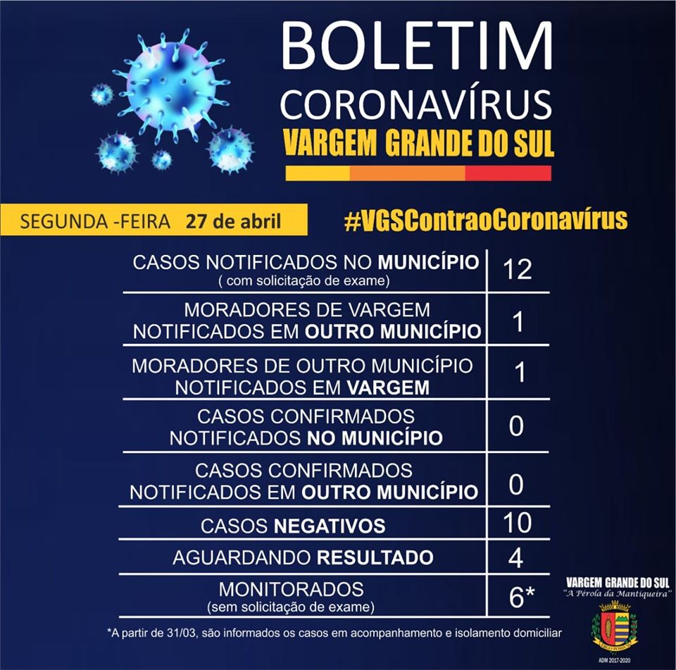 Confiram no Boletim da VE, os dados atualizados em Vargem Grande do Sul, em 27-4-2020