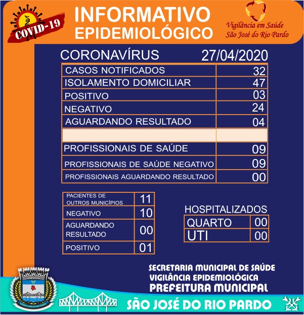 Confiram no Boletim da VE, os dados atualizados em São José do Rio Pardo, em 27-4-2020