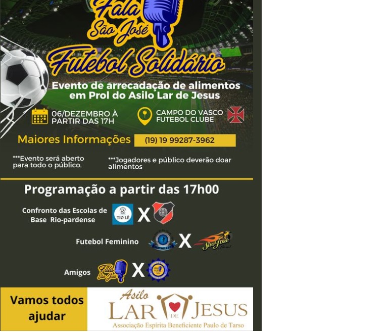 Está previsto para o dia 6 de dezembro, uma sexta-feira, o evento Fala São José Futebol Solidário, a partir das 17h00 no campo do Vasco. Segundo o responsável pela página, Luis Fernando Benedito, “o evento será beneficente ao Asilo Lar de Jesus, com arrecadação de alimentos para a entidade”.