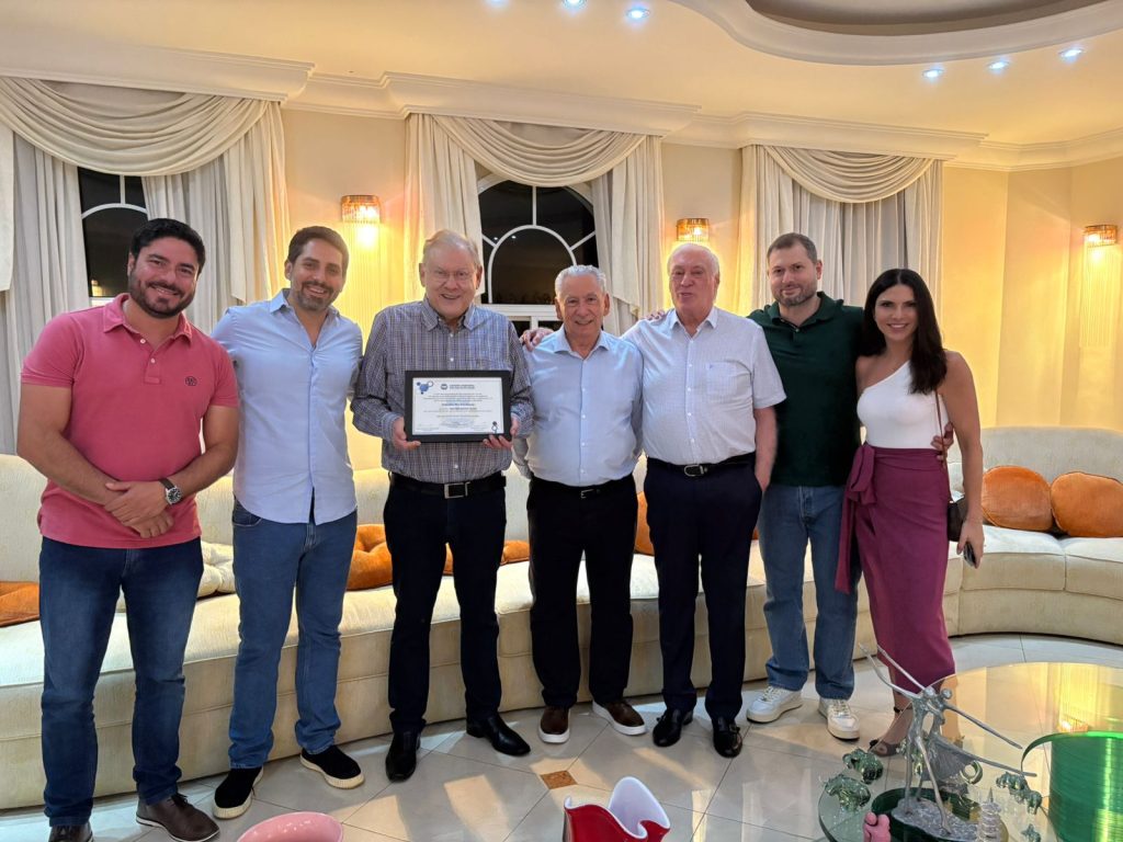 O vereador Henrique Torres, autor da indicação que deu origem à titulação fez a entrega a Milton, acompanhado pelo pai, o ex-deputado Silvio Torres, do filho do homenageado, Fábio Neves e sua esposa, Roberta, do jornalista Flavio Adauto, e do empresário Wellington Fernandez, amigo da família.