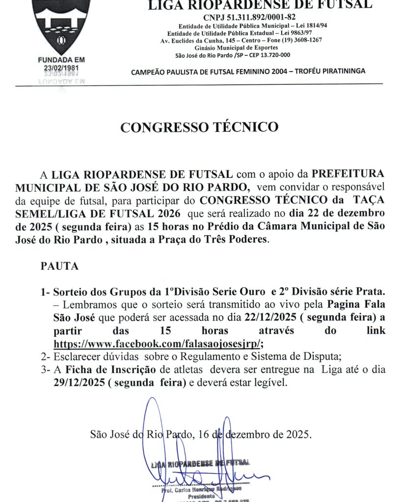 A Liga Riopardense de Futsal já se prepara para a temporada 2026 com a realização do Congresso Técnico da Taça SEMEL/Liga de Futsal, marcado para o dia 22 de dezembro de 2025, às 15h, na Câmara Municipal de São José do Rio Pardo, localizada na Praça dos Três Poderes. O encontro reunirá dirigentes, técnicos e representantes das equipes que disputarão a competição.